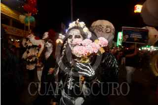 OAXACA, OAXACA, 29OCTUBRE2023.- Las calles de la capital de Oaxaca se llenaron de música y baile con la Magna Comparsa en la que participaron 43 grupos de barrios y comunidades del estado. Las comparsas o muerteadas son tradicionales en Oaxaca, cada año en la festividad de Día de Muertos en colonias y comunidades pobladores se disfrazan y salen a bailar por las calles en compañía de una banda de música. FOTO: CAROLINA JIMÉNEZ/CUARTOSCURO.COM