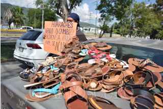 CHILPANCINGO, GUERRERO, 30OCTUBRE2023.- José Antonio Molina Serrano, quien vive en la comunidad del Playón y que se dedica a la elaboración de huaraches, arribo a la Chilpancingo para cambiar o vender todo su producto en existencia y llevar algunas despensas y apoyo para sus vecinos y familiares de la colonia Lázaro Cárdenas, en el puerto de Acapulco. José Antonio declaró que desde las 7:00 de la mañana llegó a la ciudad capital, se ubicó sobre la lateral del boulevard Vicente Guerrero, a la altura de la central de autobuses y puso sobre su vehículo huaraches y sandalias fabricados por el. FOTO: DASSAEV TÉLLEZ ADAME/CUARTOSCURO.COM