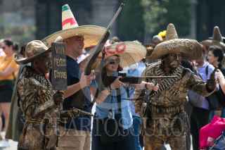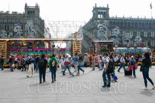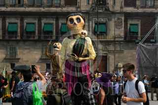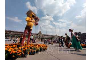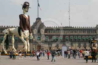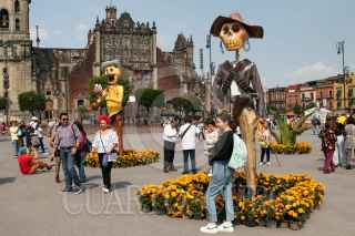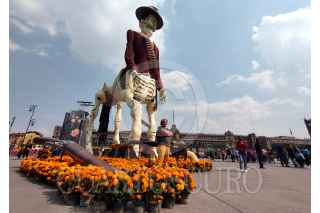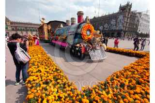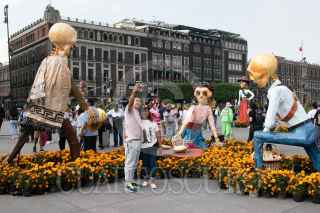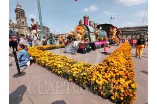 CIUDAD DE MÉXICO, 31OCTUBRE2023.- Capitalinos disfrutaron de la Mega Ofrenda 2023 instalada en el Zócalo con motivo del Día de Muertos, cuya celebración inicia el día de hoy y termina el 2 de octubre. Fueron instalados varias calacas de cartonería en la que destaca la dedicada a Francisco Villa, la cual es monumental, también se observa un locomotora alusiva a la Revolución Mexicana. FOTO: MOISÉS PABLO/CUARTOSCURO.COM