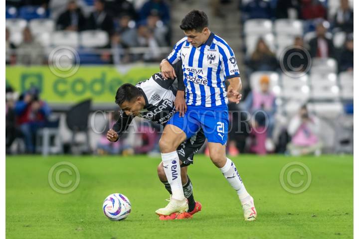 GUADALUPE, NUEVO LEÓN, 31OCTUBRE2023.- Arturo González de los Rayados del Monterrey, se disputa el balón con Jair Cortés de Necaxa, en el estadio BBVA, partido correspondiente a la jornada 15 de la Apertura 2023, Liga MX. Marcador Final: Monterrey 3 - Necaxa: 0