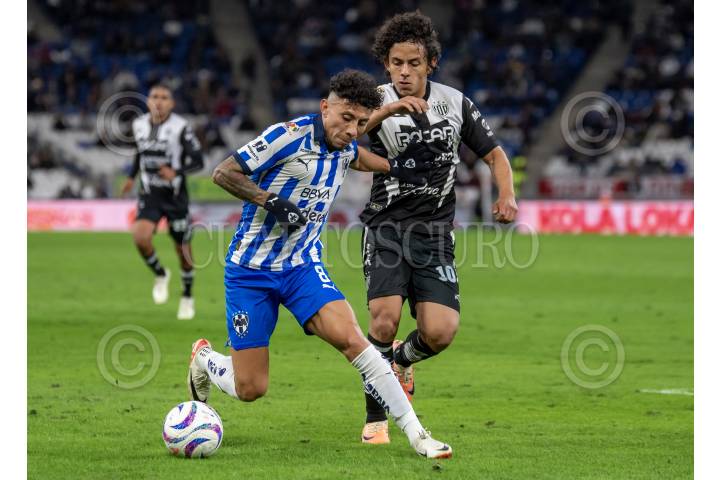 GUADALUPE, NUEVO LEÓN, 31OCTUBRE2023.- Joao Rojas de los Rayados del Monterrey, se disputa el balón con Daniel Mantilla de Necaxa, en el estadio BBVA, partido correspondiente a la jornada 15 de la Apertura 2023, Liga MX. Marcador Final: Monterrey 3 - Necaxa: 0