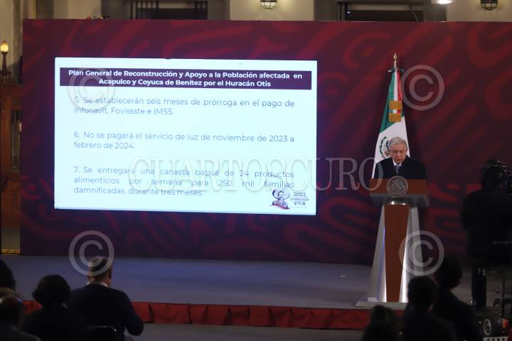 CIUDAD DE MÉXICO, 01NOVIEMBRE2023.- Andrés Manuel López Obrador, presidente de México, en compañía de parte de su gabinete y la gobernadora del Estado de Guerrero, Evelyn Salgado Pineda quien asistió a la conferencia matutina en Palacio Nacional, donde se informa la situación que guarda el puerto de Acapulco, tras el paso del huracán Otis. FOTO: EDGAR NEGRETE LIRA/CUARTOSCURO.COM