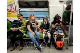 CIUDAD DE MÉXICO, 01NOVIEMBRE2023.- En el marco de la celebración de Día de Muertos y Halloween, un par de niñas disfrazadas transitan en el metro. FOTO: GRACIELA LÓPEZ /CUARTOSCURO.COM