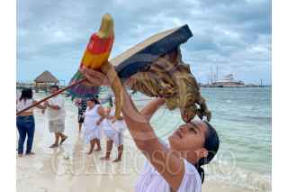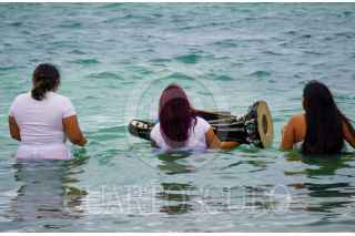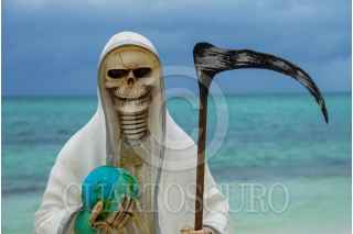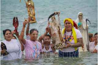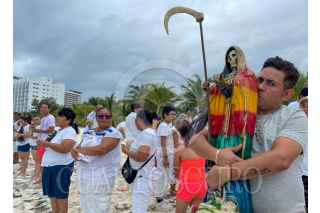 CANCÚN, QUINTANA ROO, 01NOVIEMBRE2023.- Devotos de la Santa Muerte llevan a cabo el ritual del baño de despojo en Playa del Niño, para abrir caminos y purificar la energía. Esta arraigada tradición reúne a sus fieles para honrarla y buscar protección espiritual en el mar. FOTO: ELIZABETH RUIZ/CUARTOSCURO.COM