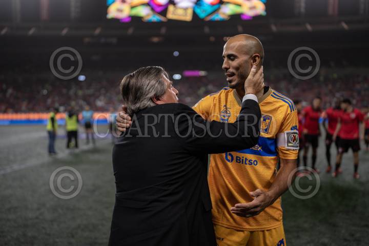 TIJUANA, BAJA CALIFORNIA, 01OCTUBRE2023.- Los Xolos de Tijuana se enfrentaron a los Tigres de la UANL, en partido correspondiente a la Jornada 14 del Torneo de Apertura 2023 de la Liga Mx. El marcador final fue a favor del equipo local con marcador de 2-0. En la imagen se muestra a Miguel Herrera saludando a sus ex jugadores. FOTO: OMAR MARTÍNEZ/ CUARTOSCURO.COM