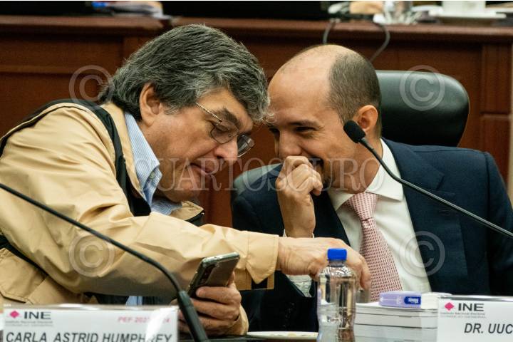 CIUDAD DE MÉXICO, 02NOVIEMBRE2023.- Los consejeros electorales Uuc-Kib Espadas y Arturo Catillo Loza conversan durante la sesión extraordinaria del Instituto Nacional Electoral (INE) en la sede central. FOTO: GALO CAÑAS/CUARTOSCURO.COM