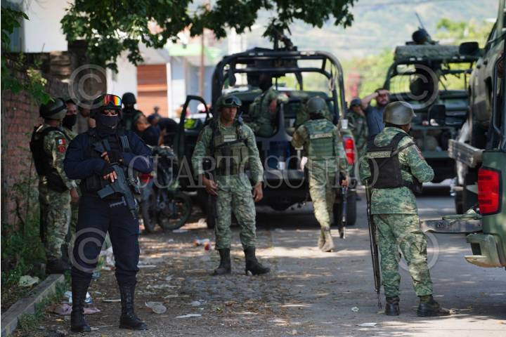 MÚGICA, MICHOACÁN. 03NOVIEMBRE2023.- Sujetos armados atacaron a balazos a elementos de la Guardia Civil, Ejército Mexicano y Guardia Nacional cuando realizaban un recorrido de vigilancia en las inmediaciones de la localidad de Nuevo Capiro. Tras repeler la agresión, policías y militares lograron detener tres hombres adultos y un menor en posesión de un fusil barret, ocho armas largas y equipo táctico. FOTO: JUAN JOSÉ ESTRADA SERAFÍN/CUARTOSCURO.COM