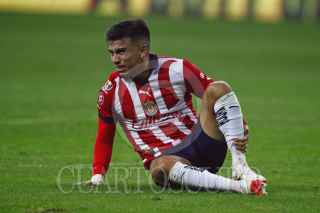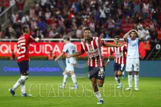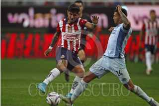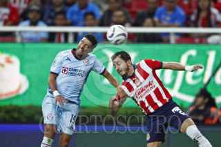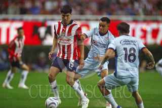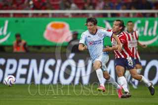 GUADALAJARA, JALISCO, 04NOVIEMBRE2023.-Carlos Rodríguez jugador de Cruz Azul disputa el balón con el contrario de Chivas, Rolando Cisneros, esto en partido correspondiente a la jornada 16 del Torneo Apertura Temporada 2023-2024 de la Liga MX, en donde se enfrentan los equipos de Chivas vs Cruz Azul en juego que se lleva a cabo en el Estadio Akron, el marcador al momento es de 0-0. FOTO: FERNANDO CARRANZA GARCIA / CUARTOSCURO.COM