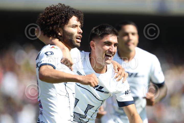 CIUDAD DE MÉXICO, 05NOVIEMBRE2023. Gustavo Del Prete festeja junto a César Huerta su anotación durante el partido de fútbol Pumas vs Atlas correspondiente a la jornada 11 del Torneo Apertura 2023 de Liga BBVA MX, en el Estadio Olímpico Universitario. FOTO: EDGAR NEGRETE/CUARTOSCURO.COM
