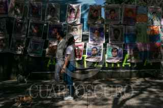 CIUDAD DE MÉXICO, 05NOVIEMBRE2023.- Rostros de los 43 normalistas de Ayotzinapa se observan en el campamento que se mantiene sobre Reforma, a la altura donde antes se ubicaban las oficinas de la PGR. Los jóvenes fueron secuestrados desde septiembre desde el 2014, y ya han pasado dos sexenios sin que se sepa su paradero a ciencia cierta. FOTO: MOISÉS PABLO/CUARTOSCURO.COM