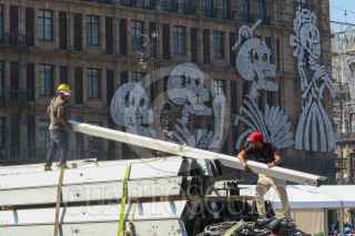 CIUDAD DE MÉXICO, 06NOVIEMBRE2023.- Trabajadores descargan vigas de acero para instalar unas a carpas en el Zócalo, esto tras concluir las actividades de Día de Muertos en el primer cuadro. FOTO: MOISÉS PABLO/CUARTOSCURO.COM