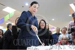 CIUDAD DE MÉXICO, 07NOVIEMBRE2023. - Marcela Guerra, presidenta de la Mesa Directiva de la Cámara de Diputados, parte su pastel en la Sala de Prensa de la cámara baja. FOTO: DANIEL AUGUSTO /CUARTOSCURO.COM