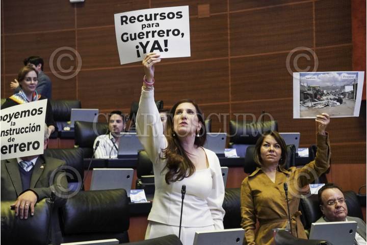CIUDAD DE MÉXICO, 07NOVIEMBRE2023.- Senadores del grupo parlamentario PAN levantan pancartas con imágenes de los estragos de Acapulco tras el Huracán Otis. Exigen acciones más radicales por parte de Andrés Manuel López Obrador para ayudar a los pobladores de Acapulco. FOTO: ANDREA MURCIA /CUARTOSCURO.COM