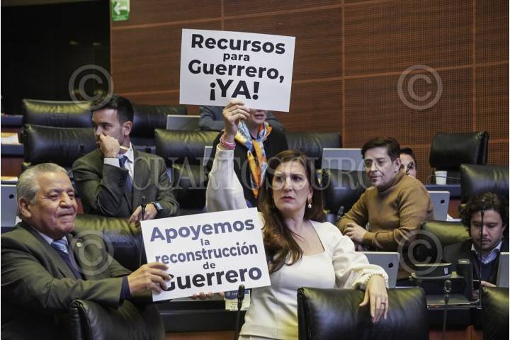 CIUDAD DE MÉXICO, 07NOVIEMBRE2023.- Senadores del grupo parlamentario PAN levantan pancartas con imágenes de los estragos de Acapulco tras el Huracán Otis. Exigen acciones más radicales por parte de Andrés Manuel López Obrador para ayudar a los pobladores de Acapulco. FOTO: ANDREA MURCIA /CUARTOSCURO.COM