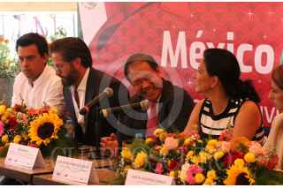 CUERNAVACA, MORELOS, 08NOVIEMBRE2023.- De izquierda a derecha los empresarios Federico Matamoros y Javier Porras, Bao Ronglin, presidente de la Cámara de Inversión y Comercio Yangtzé River México China y director general de Bicicletas Bimex, Ana Cecilia Rodríguez, secretaria de Desarrollo Económico y del Trabajo, Julieta Goldzweing, secretaria de Turismo y Cultura y el director del Fideicomiso del Fondo de Competitividad, y Promoción del Empleo, Juan Diego Pons durante la presentación de la Expo México China que se llevará a cabo del 15 al 17 de noviembre en el Centro de Convenciones Morelos. FOTO: MARGARITO PÉREZ RETANA / CUARTOSCURO.COM