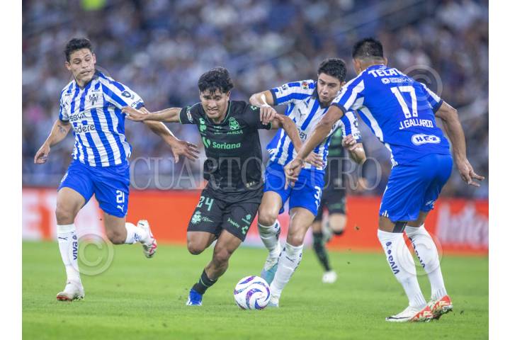 GUADALUPE, NUEVO LEÓN, 08NOVIEMBRE2023.- Stefan Medina de los Rayados del Monterrey, se disputa el balón con Diego Medina de Santos, en el estadio BBVA, partido correspondiente a la jornada 10 de la Apertura 2023. Marcador Final: Monterrey 3 - Santos: 0 FOTO: GABRIELA PÉREZ MONTIEL / CUARTOSCURO.COM