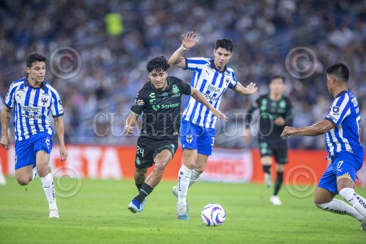 GUADALUPE, NUEVO LEÓN, 08NOVIEMBRE2023.- Stefan Medina de los Rayados del Monterrey, se disputa el balón con Diego Medina de Santos, en el estadio BBVA, partido correspondiente a la jornada 10 de la Apertura 2023. Marcador Final: Monterrey 3 - Santos: 0 FOTO: GABRIELA PÉREZ MONTIEL / CUARTOSCURO.COM