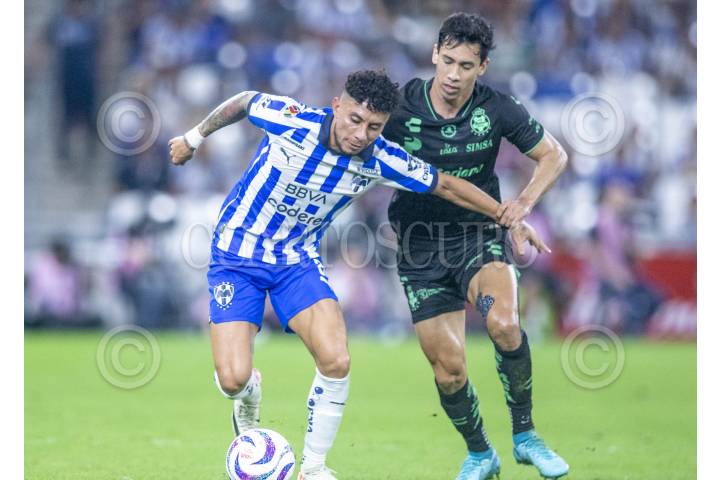 GUADALUPE, NUEVO LEÓN, 08NOVIEMBRE2023.- César Bustos de los Rayados del Monterrey, se disputa el balón con Ismael Govea de Santos, en el estadio BBVA, partido correspondiente a la jornada 10 de la Apertura 2023. Marcador Final: Monterrey 3 - Santos: 0 FOTO: GABRIELA PÉREZ MONTIEL / CUARTOSCURO.COM