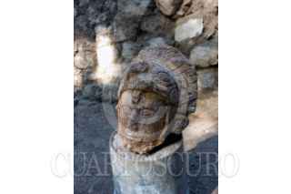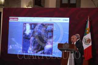 CHICHÉN ITZÁ, YUCATÁN, 09NOVIEMBRE2023.- Ceñido con un yelmo de serpiente con las fauces abiertas y un tocado de plumas, el rostro esculpido de un guerrero emergió durante las excavaciones que se efectúan con recursos del Programa de Mejoramiento de Zonas Arqueológicas (Promeza), en el llamado Templo 6 de Maudslay, perteneciente al conjunto Casa Colorada de Chichén Itzá, en el estado de Yucatán. El más reciente descubrimiento en “la ciudad al borde del pozo de los itzáes”, significado del nombre del sitio en lengua maya, fue dado a conocer en la conferencia matutina del presidente de México, Andrés Manuel López Obrador, por el director general del Instituto Nacional de Antropología e Historia (INAH), Diego Prieto Hernández, quien presentó los últimos reportes del salvamento arqueológico realizado en su fase conclusiva en las obras del Tren Maya. FOTO: INAH/CUARTOSCURO.COM