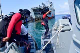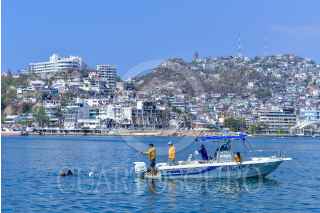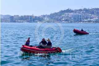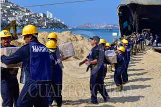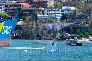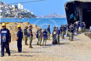 ACAPULCO, GUERRERO, 11NOVIEMBRE2023.- Agentes de la Marina realizan labores de rescate de embarcaciones hundidas y búsqueda de personas desaparecidas en el mar tras el paso del huracán Otis. Buzos especializados llevan acabo inmersiónes en las zonas de barcos para localizar cuerpos, mientras que con draga las sacan a flote para colocarlas en la bahía del puerto. A su vez, realizaron el desembarque de 80 toneladas de víveres para ser repartidos entre la población acapulqueña. FOTO: CARLOS ALBERTO CARBAJAL/CUARTOSCURO.COM