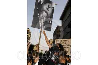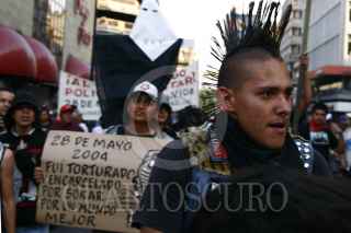 GUADALAJARA, JALISCO. MEXICO., 28 MAYO 2007.- Altermundistas y globalifobicos conmemoraron el tercer aniversario del enfrentamiento que tuvieron con la fuerza publica en el marco de la tercera cumbre de Jefes de estado de América Lantina El Caribe y la Unión Europea. En la manifestación se exigió que el actual Secretario de Gobernación el entonces gobernador de Jalisco Francisco Javier Ramirez Acuña sea castigado por los abusos que cometieron los Policias. FOTO: JOSE MARIA MARTINEZ/CUARTOSCURO.COM