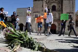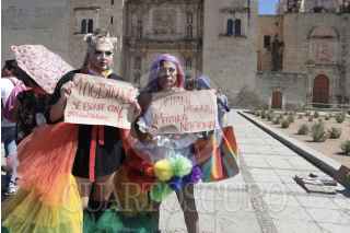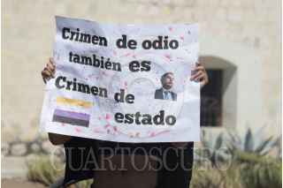OAXACA, OAXACA, 14NOVIEMBRE2023.- Integrantes de la comunidad LGBTQ+ se manifestaron en el atrio del templo de Santo Domingo de Guzmán, en la capital de Oaxaca, para exigir justicia para el magistrade Jesús Ociel Baena Saucedo. Además exigieron leyes firmes para castigar crimines de odio contra la comunidad. FOTO: CAROLINA JIMÉNEZ/CUARTOSCURO.COM
