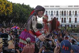 GUADALAJARA, JALISCO, 14NOVIEMBRE2023.- Hoy llego a la ciudad Amal, la marioneta de 3.6 metros de altura, misma que representa a una niña Siria de 10 años de edad y el mensaje en sus recorridos es crear conciencia en los desafíos que representa la migración en el mundo, principalmente para los menores de edad que tienen que dejar su país buscando reunirse con su familia y terminan siendo refugiados huyendo de la Guerra. Amal a recorrido 15 países y busca convertirse en un símbolo mundial de los derechos humanos. FOTO: FERNANDO CARRANZA GARCIA / CUARTOSCURO.COM