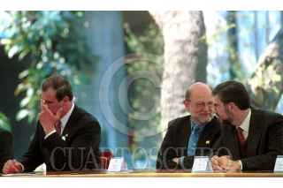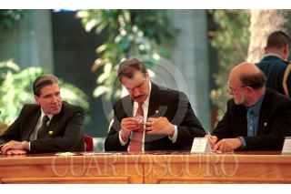 Vicente Fox se coloca el broche distintivo de la Cruzada por la calidad en la Salud, ante la mirada de Julio Frenk Mora y José Sarukhán. FOTO: Christian Palma/CUARTOSCURO.COM