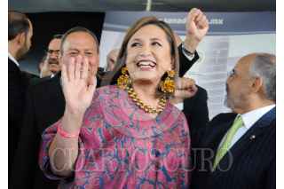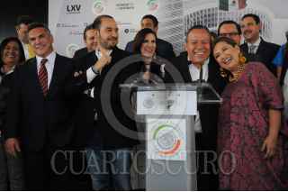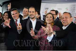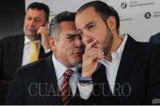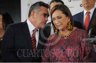 CIUDAD DE MÉXICO, 15NOVIEMBRE2023. - Los dirigentes del PRI y el PAN, Alejandro Moreno y Marko Cortés, dialogan durante la conferencia de Xóchitl Gálvez. FOTO: DANIEL AUGUSTO /CUARTOSCURO.COM