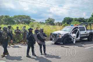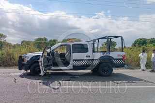MEDELLIN DE BRAVO, VERACRUZ, 16NOVIEMBRE2023.- En esta entidad del estado fue activado el código rojo en toda la zona conurbada debido a un fuerte enfrentamiento con arma de fuego en la carretera Santa Fe-Paso Del Toro, en el municipio de Medellín de Bravo. Elementos a bordo a la unidad 3470 de combate al robo de vehículos de la Secretaría de Seguridad Pública de Veracruz, fueron atacados con arma de fuego por sujetos que se dieron a la fuga. Abandonando dos camionetas que también presentan impactos de bala. Diferentes corporaciones continúan el operativo para buscar a los responsables. FOTO: VICTORIA RAZO/CUARTOSCURO.COM