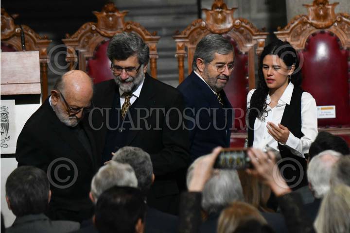 CIUDAD DE MÉXICO, 17NOVIEMBRE2023.- Los ex rectores de la UNAM: José Sarukhán, Francisco Barnes, y Juan Ramón de la Fuente, junto a Luisa María Alcalde, secretaria de Gobernación, durante la ceremonia de toma de protesta de Leonardo Lomelí Vanegas como nuevo rector de la Universidad Nacional Autónoma de México para el periodo 2023-2027. FOTO: MARIO JASSO/CUARTOSCURO.COM