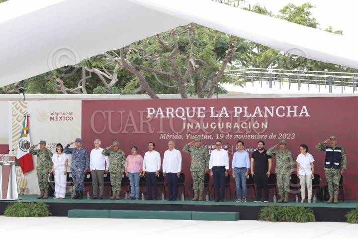 MÉRIDA, YUCATÁN 19NOVIEMBRE2023.- Hoy por la mañana el Presidente de la República, Andrés Manuel López Obrador, acompañado del gobernador del estado de Yucatán, Mauricio Vila Dosal y otras autoridades del gabinete federal; inauguraron el Gran Parque de la Plancha, el cual cuenta con áreas verdes, juegos infantiles, lago artificial, mercado gastronómico, skatepark, zonas deportivas, museos, entre otros atracciones. FOTO: MARTÍN ZETINA/CUARTOSCURO.COM