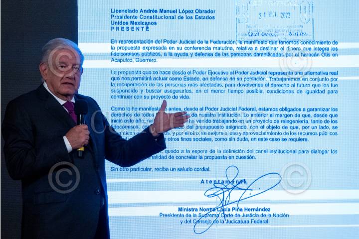 CIUDA DE MÉXICO, 21NOVIEMBRE2023.- Andrés Manuel López Obrador, presidente de México, muestra el oficio presentado por el Poder Judicial respecto a la propuesta para destinar los fideicomisos a los damnificados de Huracán Otis en Acapulco. Lo anterior durante la conferencia matutina en compañía de Jorge Alcocer, secretario de Salud, Ruy López Ridaura, subsecretario de Prevención y Promoción a la Salud, y Zoe Robledo, director general del Instituto Mexicano del Seguro Social (IMSS) encabezaron la conferencia matutina para dar detalles sobre el informe quincenal de salud denominado “Pulso de la Salud”. FOTO: GALO CAÑAS/CUARTOSCURO.COM