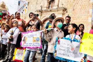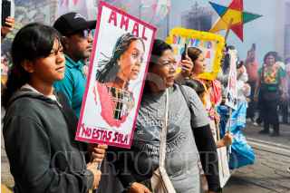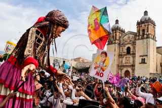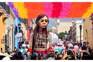 OAXACA, OAXACA, 23NOVIEMBRE2023.- El viaje de Amal continuó este jueves en la ciudad de Oaxaca, en donde encabezó una calenda por el andador turístico que culminó en la Alameda de León. Amal, la marioneta gigante que representa a una niña siria en busca de su madre, convivió con decenas de personas, en su mayoría niñas y niños, hasta los que llevó su mensaje de paz. FOTO: CAROLINA JIMÉNEZ/CUARTOSCURO.COM