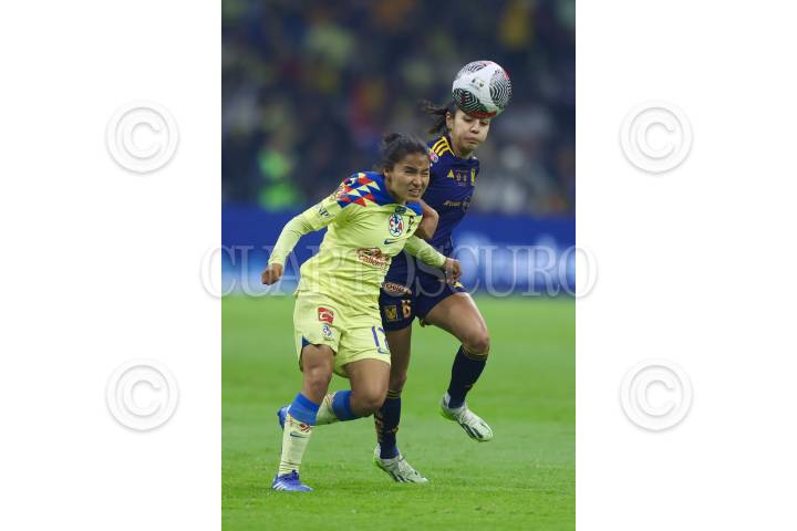 CIUDAD DE MÉXICO, 24NOVIEMBRE2023. María Mauleon de América y Alexia Delgado de Tigres disputan una pelota durante el partido de fútbol América vs Tigres correspondiente a la final de ida del Torneo Apertura 2023 de Liga BBVA MX Femenil, en el Estadio Azteca. FOTO: EDGAR NEGRETE/CUARTOSCURO.COM