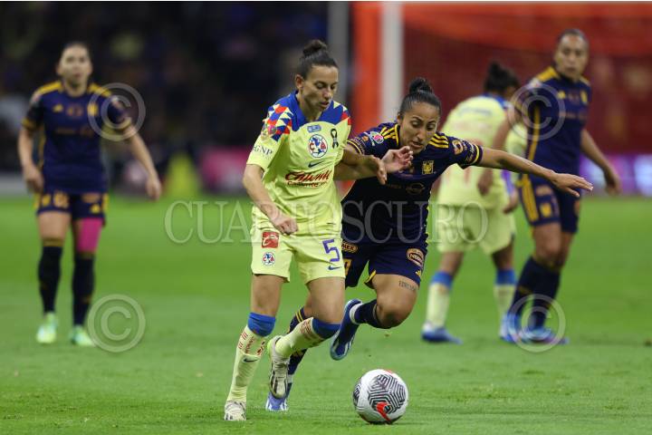 CIUDAD DE MÉXICO, 24NOVIEMBRE2023. Aurelie Kaci del América y Sandra Mayor de Tigres disputan una pelota durante el partido de fútbol América vs Tigres correspondiente a la final de ida del Torneo Apertura 2023 de Liga BBVA MX Femenil, en el Estadio Azteca. FOTO: EDGAR NEGRETE/CUARTOSCURO.COM