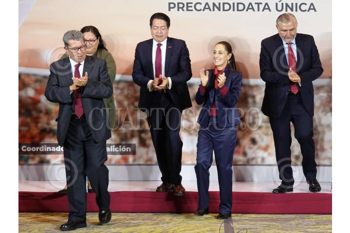 CIUDAD DE MÉXICO, 21NOVIEMBRE2023.- Claudia Sheinbaum, precandidata a la presidencia por Morena, acompañada de los senadores Ricardo Monreal y Citlalli Hernández, y Mario Delgado, líder nacional de Morena, y Adán Augusto, ex aspirante a la candidatura presidencial, durante el término de la presentación del equipo de su precampaña en el Hotel Couyard. FOTO: GRACIELA LÓPEZ /CUARTOSCURO.COM
