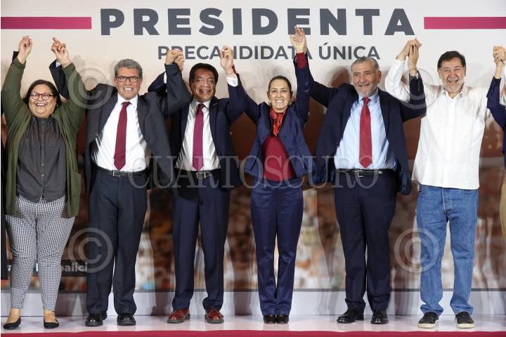 CIUDAD DE MÉXICO, 21NOVIEMBRE2023.- Los senadores Citlalli Hernández y Ricardo Monreal; Mario Delgado, líder Nacional de Morena; Claudia Sheinbaum, precandidata a la presidencia por Morena; Adán Augusto, excandidato presidencial por Morena, y Gerardo Fernández Noroña, vocero de Claudia Sheinbaum, durante la presentación del equipo de su precampaña en el Hotel Couyard. FOTO: GRACIELA LÓPEZ /CUARTOSCURO.COM