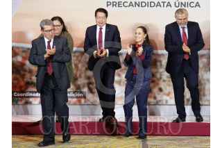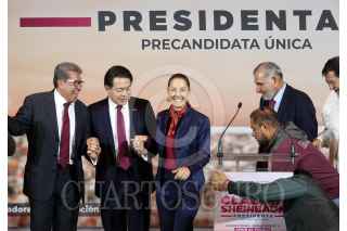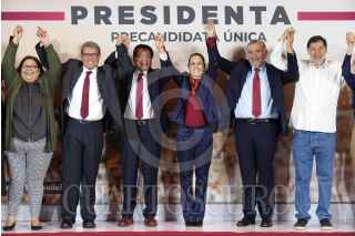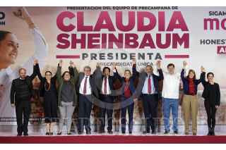 CIUDAD DE MÉXICO, 21NOVIEMBRE2023.- Jesús Valdés Peña, embajador de México en Haití; la política Esthela Damián Peralta, los senadores Citlalli Hernández y Ricardo Monreal, Mario Delgado, presidente Nacional de Morena; Claudia Sheinbaum, precandidata a la presidencia por Morena; Adán Augusto, excandidato presidencial; Gerardo Fernández Noroña, vocero de Claudia Sheinabum; Tatiana Clouthier, exsecretaria de Economía, y Renata Turrent, profesora y periodista, durante la presentación de los cargos de su equipo de precampaña realizada en el Hotel Couyard. FOTO: GRACIELA LÓPEZ /CUARTOSCURO.COM