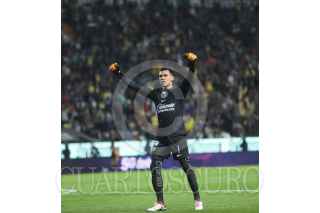 LEÓN, GUANAJUATO, 29NOVIEMBRE2023.- El León empató a dos goles contra el América, en el Estadio León, en el primer encuentro de Cuartos de Final de la Liguilla MX. En la imagen el portero americanista Luis Ángel Malagón festeja una de las anotaciones de su escuadra. FOTO: JORGE ORTEGA/CUARTOSCURO.COM