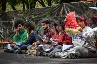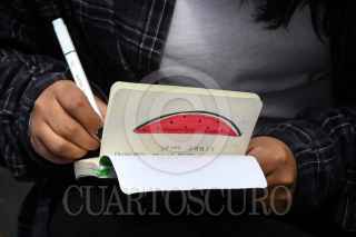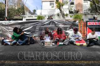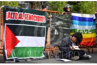 CIUDAD DE MÉXICO, 30NOVIEMBRE2023.- Integrantes de "Estudiantes en construcción de paz e interculturalidad de la UNAM"; Eje de iglesias y Espirituales; Brigada Nacional de Búsqueda, y del Servicio paz y justicia México (SERPAK), realizaron un ayuno público ecuménico escribiendo mensajes de paz al exterior de la embajada de Israel en apoyo al pueblo palestino. FOTO: MARIO JASSO/CUARTOSCURO.COM
