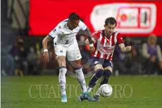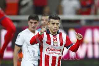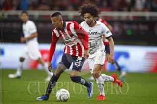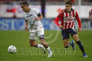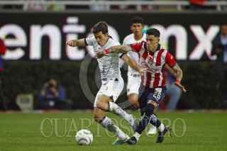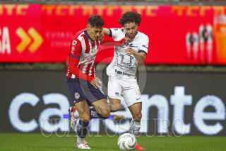 ZAPOPAN, JALISCO, 30NOVIEMBRE2023.-Jesus Orozco jugador de Chivas disputa el balón con el contrario de Pumas, Cesar Huerta, esto en partido correspondiente a los Cuartos de Final de ida del Torneo Apertura Temporada 2023-2024 de la Liga MX, en donde se enfrentan los equipos de Chivas vs Pumas en juego que se lleva a cabo en el Estadio Akron, el marcador al final es de 1-0 a favor del equipo de casa. FOTO: FERNANDO CARRANZA GARCIA / CUARTOSCURO.COM