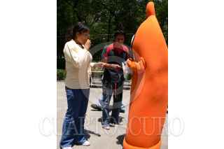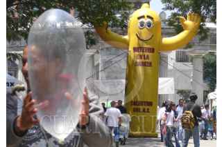 MÉXICO, D.F. 02JUNIO2007.- Se inauguró esta mañana la Feria informativa ExpoSida en Alameda central donde participaron organizaciones para prevenir el VIH y ayudar a personas que viven con este virus. En la imagen un expositor muestra el condón femenino. FOTO: PATRICIA MORALES/CUARTOSCURO.COM