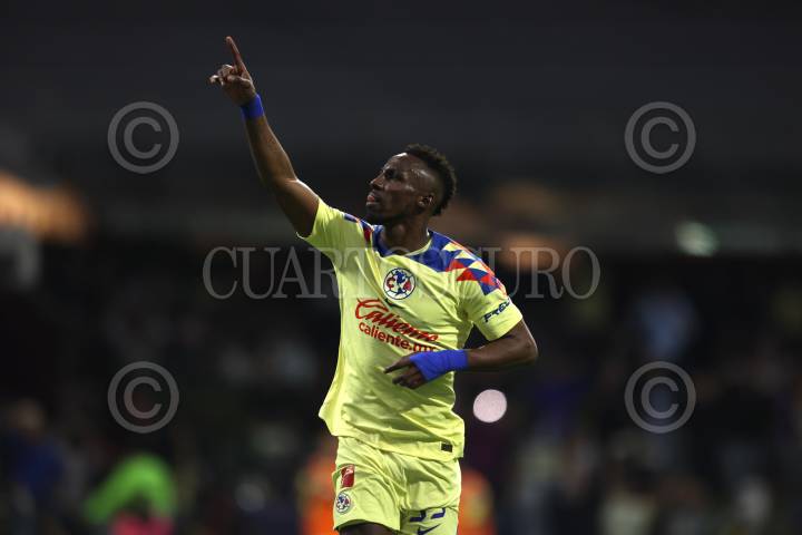 CIUDAD DE MÉXICO, 02DICIEMBRE2023. Festejo del jugador Julián Quiñónez tras anotar de tiro penal durante el partido de fútbol América vs León correspondiente a los cuartos de final juego de vuelta del Torneo Apertura 2023 de Liga BBVA MX, en el Estadio Azteca. FOTO: EDGAR NEGRETE/CUARTOSCURO.COM