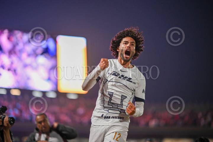 CIUDAD DE MÉXICO, 04DICIEMBRE2023.- Pumas se impuso con claridad a las Chivas Rayadas de Guadalajara en el juego de vuelta de los cuartos de final del Apertura 2023 de la Liga MX y se clasificó a semifinales con un marcador global de 3 goles a 1. En la imagen César "Chino" Huerta festeja la segunda anotación de los universitarios. FOTO: CORTESÍA CLUB PUMAS/CUARTOSCURO.COM
