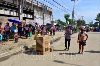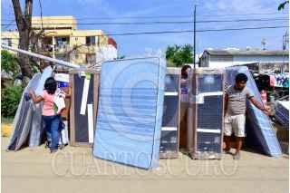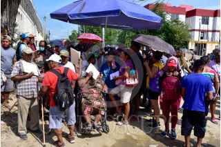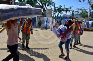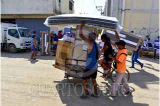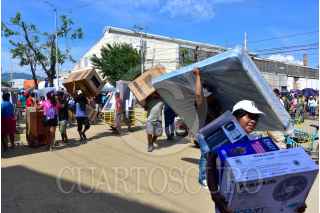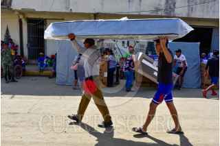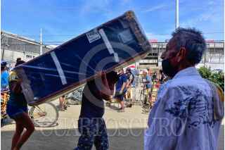 ACAPULCO, GUERRERO, 04DICIEMBRE2023.- Personas afectadas por el huracán Otis, esperan haciendo fila bajo el sol varias horas para recibir los enseres domésticos que les entrega el gobierno Federal. Vecinos de Ciudad Renacimiento, una de las colonias ubicadas en la zona de la periferia del puerto, se llevaron sus enseres de manera desesperada, transportándolos a sus casas como pudieron. Los apoyos consisten un un ventilador, licuadora, colchón, refrigerador, sartenes y una estufa. FOTO: CARLOS ALBERTO CARBAJAL/CUARTOSCURO.COM