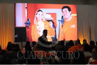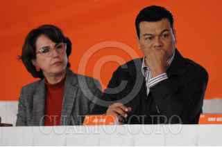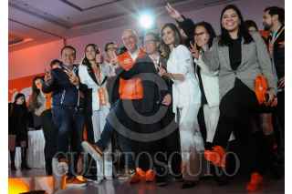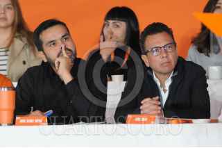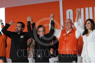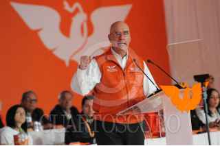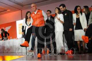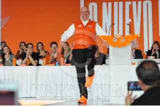 CIUDAD DE MÉXICO, 04DICIEMBRE2023. - Dante Delgado, dirigente nacional de Movimiento Ciudadano, muestra sus tenis naranjas durante su discurso, al terminar el conclave del partido para decidir a su candidato presidencial, la cual quedó en vilo hasta enero de 2024. FOTO: DANIEL AUGUSTO /CUARTOSCURO.COM