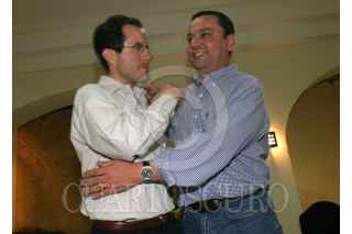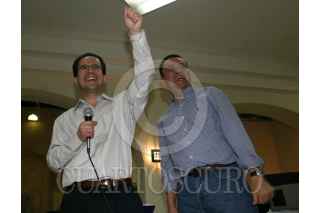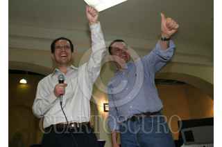 LEÓN, GUANAJUATO, 02JUNIO2007.- Cesar Nava, Secretario Particular y Germán Martínez, Secretario de la Función Pública, celebran sus respectivas victorias en las elecciones para integrantes del Consejo Nacional en le XX Asamblea Nacional del PAN. FOTO: MOISÉS PABLO/CUARTOSCURO.COM