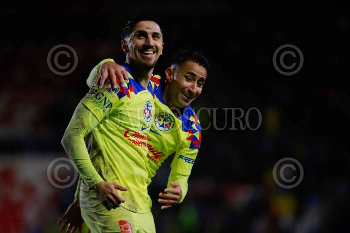 SAN LUIS POTOSÍ, SAN LUIS POTOSÍ, 06DICIEMBRE2023.- Diego Valdez del America en festejo del tercer gol durante el partido de ida de las Semifinales del Torneo Apertura 2023 de la Liga BBVA MX en el Estadio Alfonso Lastras. FOTO: CÉSAR GÓMEZ/CUARTOSCURO.COM