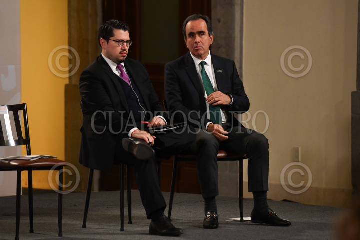 CIUDAD DE MÉXICO, 07DICIEMBRE2023.- Carlos Martínez Velázquez, director general de Instituto del Fondo Nacional de la Vivienda para los Trabajadores (INFONAVIT), y César Buenrostro Moreno, vocal ejecutivo del Fondo de la Vivienda del Instituto de Seguridad y Servicios Sociales de los Trabajadores del Estado, durante su intervención en la conferencia de prensa matutina realizada en Palacio Nacional. FOTO: MARIO JASSO/CUARTOSCURO.COM